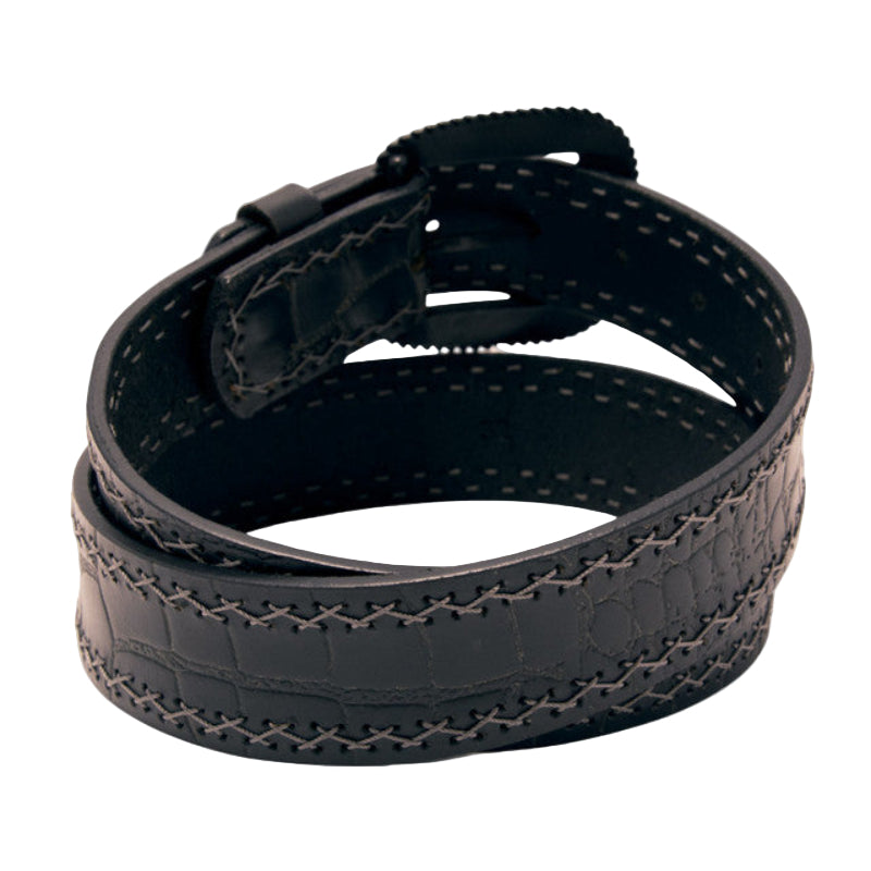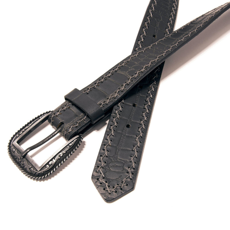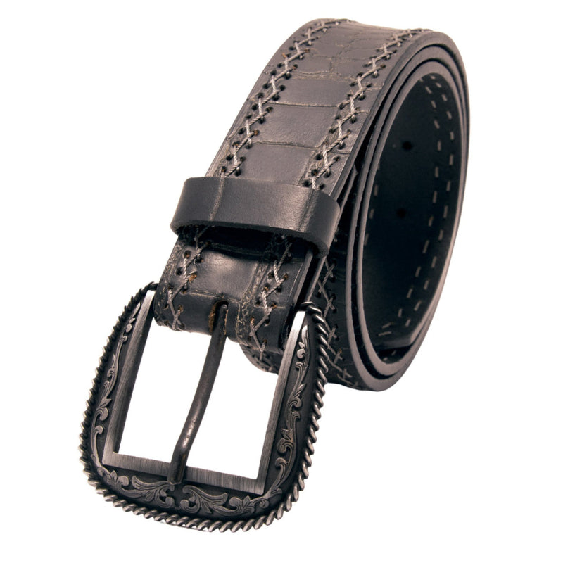 Features a textured gator-like pattern that adds bold character to the classic cowboy or cowgirl styling as well as adding strength and durability to the life of the item itself. Crafted from durable, high quality materials offering a sleek ebony finish and eye-catching crisscross stitching details that add texture and interest. It's perfect for everyday jeans or for a dressy night on the town. Has a high finish silvertone removable buckle with swirls and serifs. Finishes include: 1-1/2 inches wide and 1" between holes. Choose your size from the drop-down menu.