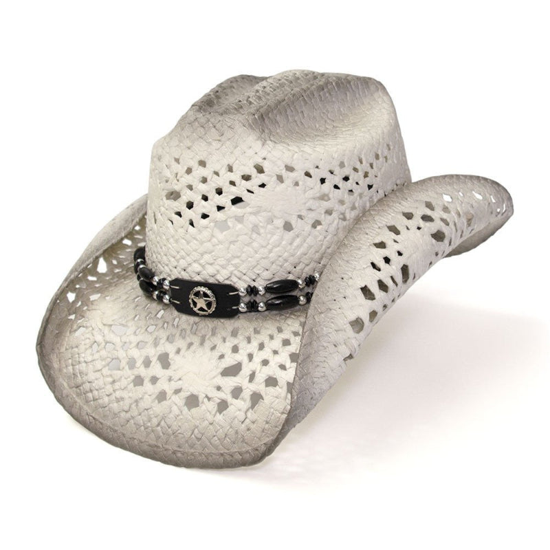 White & Gray Straw Western Hat with Beaded Texas Star Hat Band