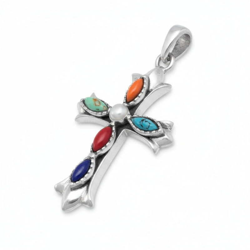 A rainbow of colors measuring 36.5mm x 20mm set in brilliant silver with 6mm x 2mm marquise shaped reconstituted pink and red coral, green and blue turquoise and blue lapis. Color and stones will vary slightly due to natural color variations in semi-previous stones, so no two pendants are alike. Photo is representative of design, shape, and stone colors only. Necklace chain sold separately. Findings .925 Sterling Silver.