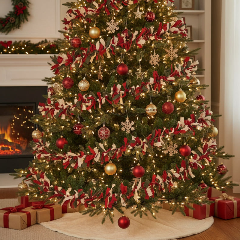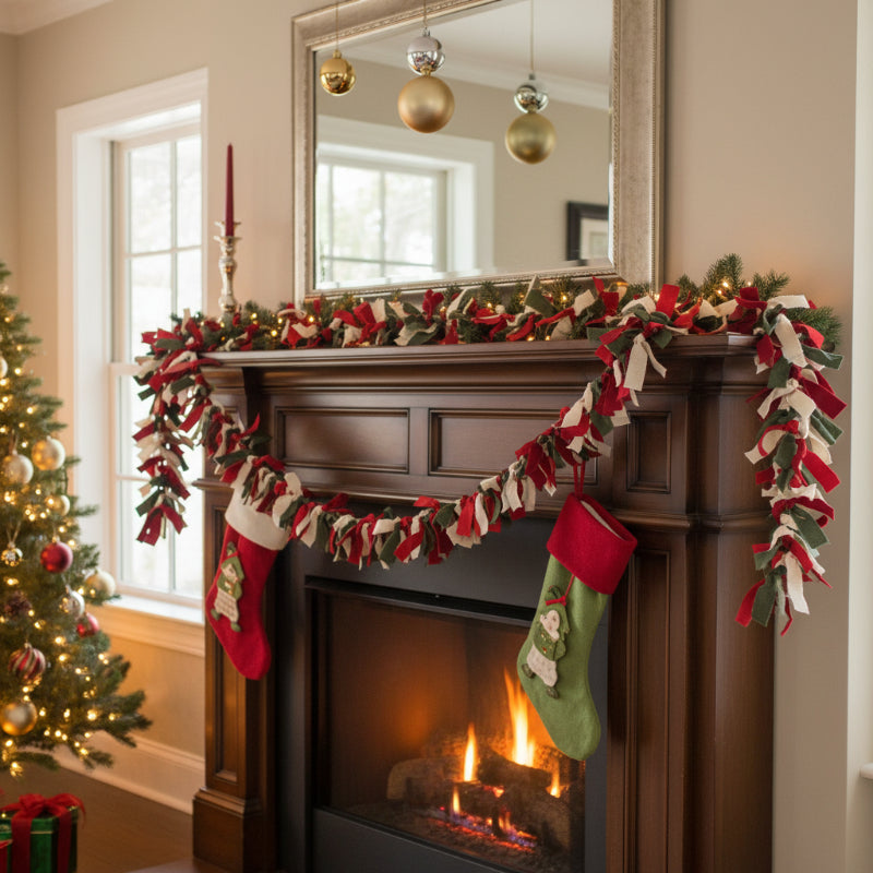 Decorative cloth tied with festive colors and a rustic design, all built on a base of thick jute twine, raw edged in holiday shades. Each section features a hanging look for easy display and can be connected end-to-end for continuous wrap or displaying on a fireplace mantle, banister rail, or table edge. Each section measures approximately 28 inches long.