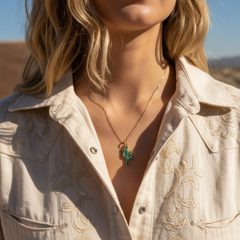 Saguaro in bloom. 16" + 2" extension 14 karat gold plated over sterling silver with 20 1mm green CZ's and three 1mm white CZ flowers. Charm measures 7.2mm x 18.5mm and floats on a 1mm cable chain with sturdy lobster clasp closure. See also our matching earrings, Item # 66296. .925 Sterling Silver.