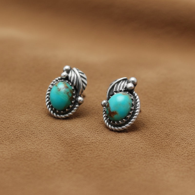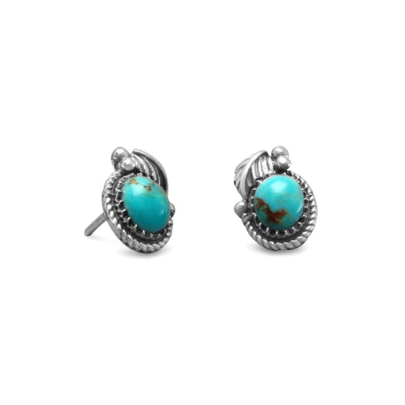 Oxidized studs with southwestern style reconstituted stones. The 5mm x 7mm (1/4" x 3/8") turquoise stones have a very detailed shiny twisted and beaded leaf design around the stones. Due to the inherent nature of natural stones, each matched pair will vary slightly in color and veining. .925 Sterling Silver.
