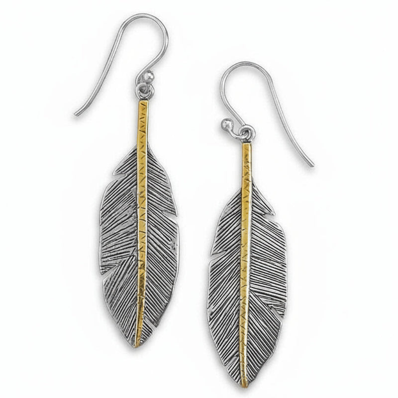 Oxidized sterling silver feather drop French wire earrings with 14 karat gold-plated & sterling silver accents. The earrings measure approximately 13mm x 55mm. .925 Sterling Silver. See our matching feather bangle bracelet, Item #23112, sold separately.