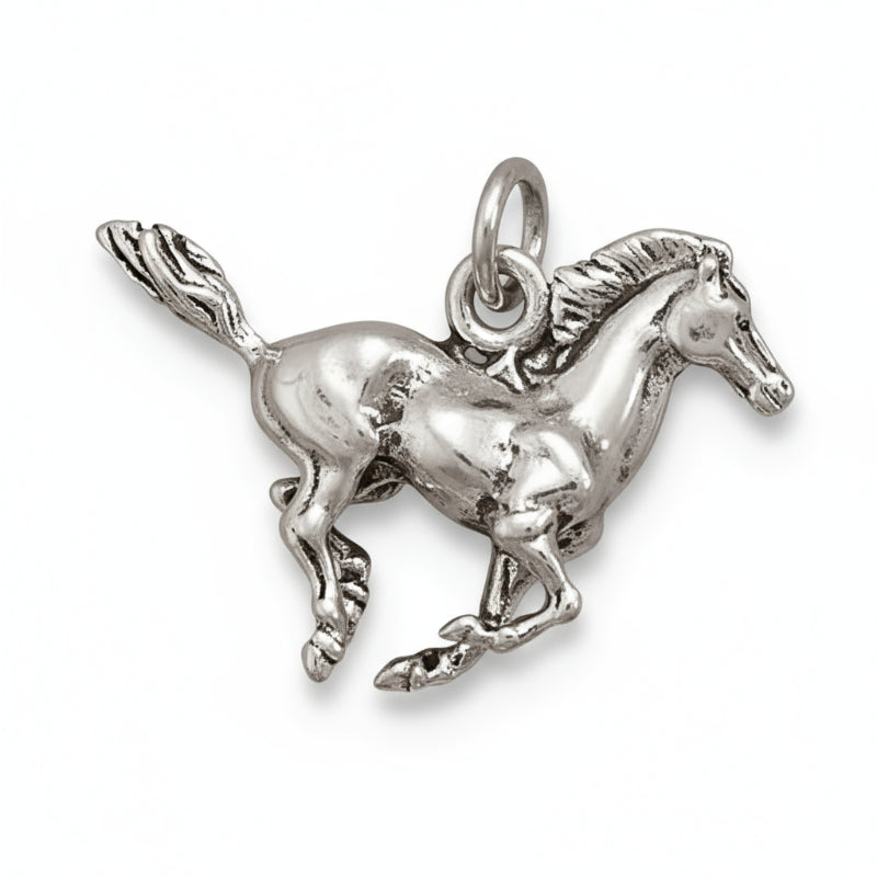 Intricately detailed running stallion. Perfect for your charm bracelet or necklace chain. Charm measures 18mm x 23mm. .925 Sterling Silver.
