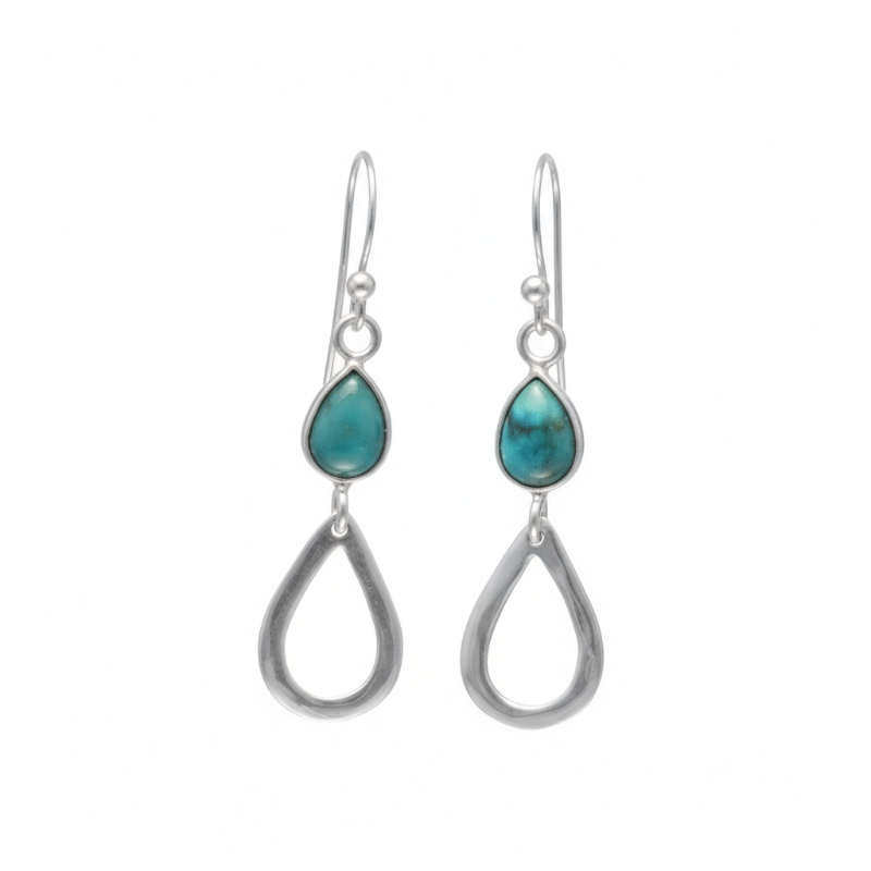 Sterling silver and turquoise pear shape drop French wire earrings. Turquoise is approximately 7.5mm x 4mm and the earrings measure 41mm x 9.5mm. 4mm x 6mm oval stones set securely into a shining silver 4-pront setting with silver backs. No two pairs will be identical. Some variation in color may occur as is inherent with natural stones. .925 Sterling Silver.