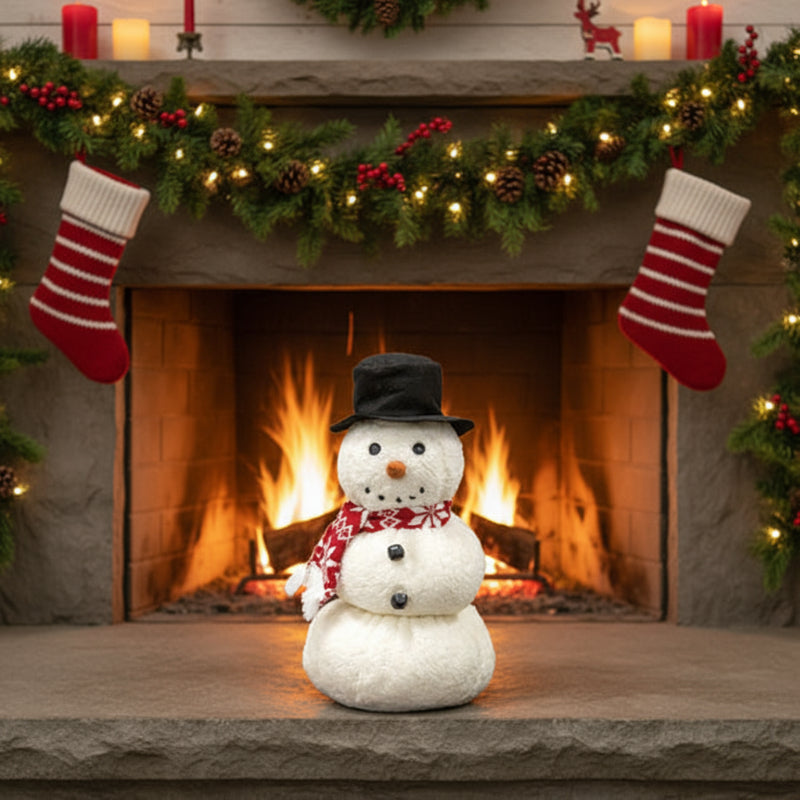 This delightfully darling plush, top hat-wearing snow man has a fuzzy feel all over and is weighted in the bottom to keep his balanced and upright to display on any flat, horizontal surface. His friendly face is made of black beads, buttons, and an orange stuffed carrot nose. He's wearing a festive knitted red and white winter scarf and is adorned with a pair of jingle bells on his belly. Three soft, adorable tiers that are huggably soft are a must for any collector and he ships to anywhere without worries of weight or breaking. For decorative use only and not intended to be a toy for children due to choking hazard.
