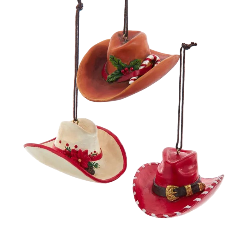 NEW FOR 2025! A Kurt Adler exclusive, these festive hats will bring a bit of the Wild West to your holiday decor. Sold as a collection of three as shown, each showcases beautifully crafted western-style with intricate details and vibrant trims including holly and candy cane, poinsettia hat band, and a gold and black belt buckle, one of each design. Ready to hang on your holiday tree, each comes with a hanger.