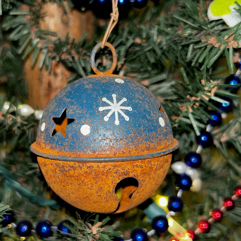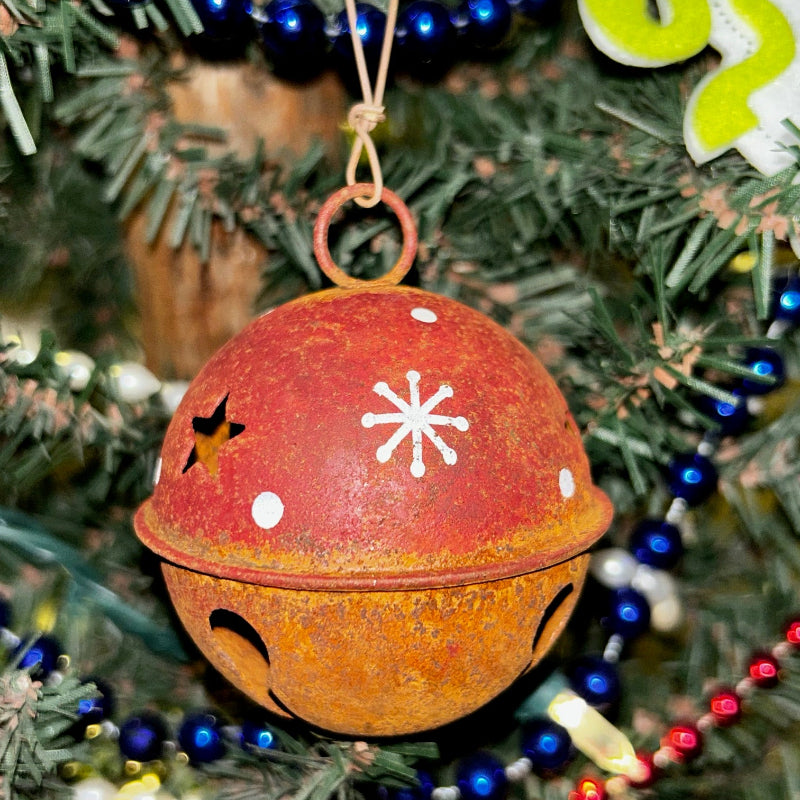 NEW FOR 2025! White snowflakes, open stars and keyholes on a rust-color, acid finished metal sphere that makes them look vintage and each one has a clear glass marble inside. O-ring and metal hanger for easy hanging on your holiday tree. Sold individually. Available in three finishes; blue, red, and white tops. Make your color selection from the drop-down menu. By Mission Gallery.