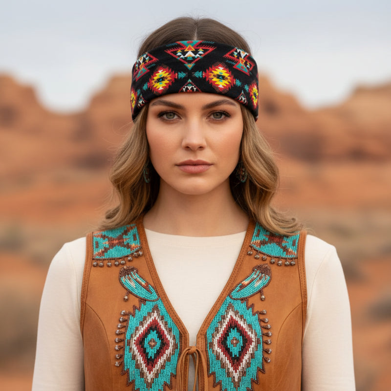 Made in the USA. Colorful Native American inspired southwestern chevrons bordered by smaller designs in red, orange, green, blue, and yellow. Each bandanna measures 22" x 22" and is printed on 50/50 poly cotton blend for durability and long lasting color. Sewn finished edges. Great for cowboys, cowgirls, athletes, workers, bikers and anyone wanting to make a stylish western fashion statement. Sold individually.
