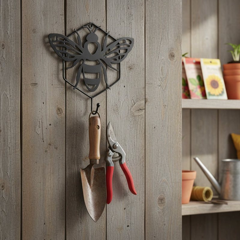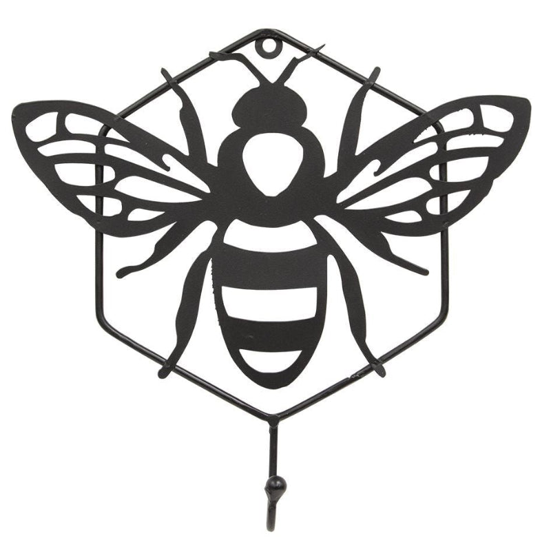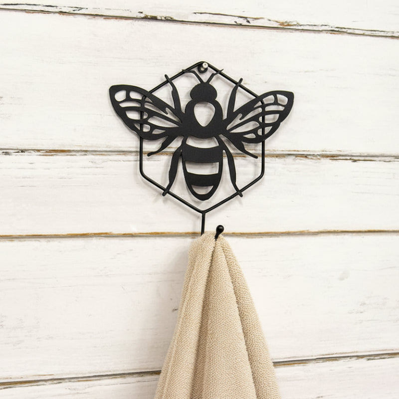 Laser cutout in the shape of a bumblebee silhouette with a hexagonal frame around it and includes a sturdy hook at the bottom for holding jackets, hats, purses, tote bags, in the kitchen for dish towels, utensils, crafting supplies, scissors or other accessories. Or, use it at your potting table or shed for holding gardening essentials. Has a pre-drilled hole at the top for hanging on a hook, nail, or adding a screw for a secure, permanent mounting. Sold individually.