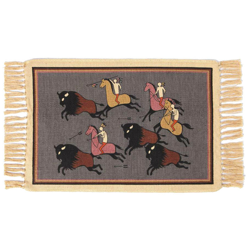 CLOSEOUTS - Four hieroglyphic style horsemen with spears are on the great hunting adventure to capture Tatanka in soft colors of tan, ivory, rose, brown, and black with small hints of red inside a neutral-colored border. Stenciled design on 100% cotton with knotted tassels. Wipe clean with a damp sponge or cloth. Sold individually.