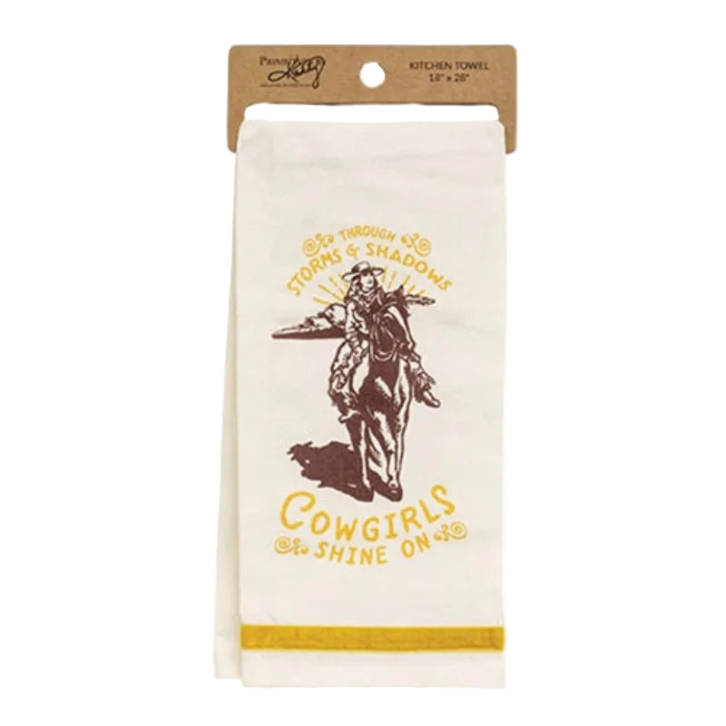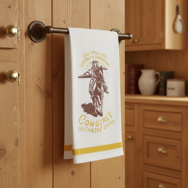 Made from 100% washable, dryable cream-colored cotton with a mustard-colored velvet ribbon accent. Printed in a warm brown and mustard shades depicts a cowgirl on horseback. Text reads, "through storms and shadows, cowgirls shine on" in a handwritten style font, accented by swirling flourishes.