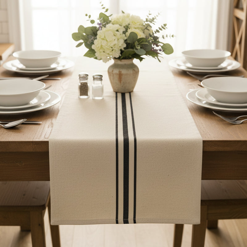 Made of 100% washable, dryable cotton and features three black stripes, two thin and one wide, running down the center. Perfect for accenting your dining room centerpiece or kitchen eat-in table to protect surfaces from scratches and wear. See our other sizes and matching accessories, sold separately.