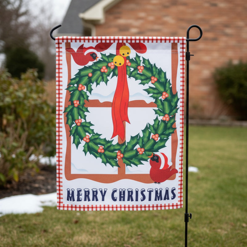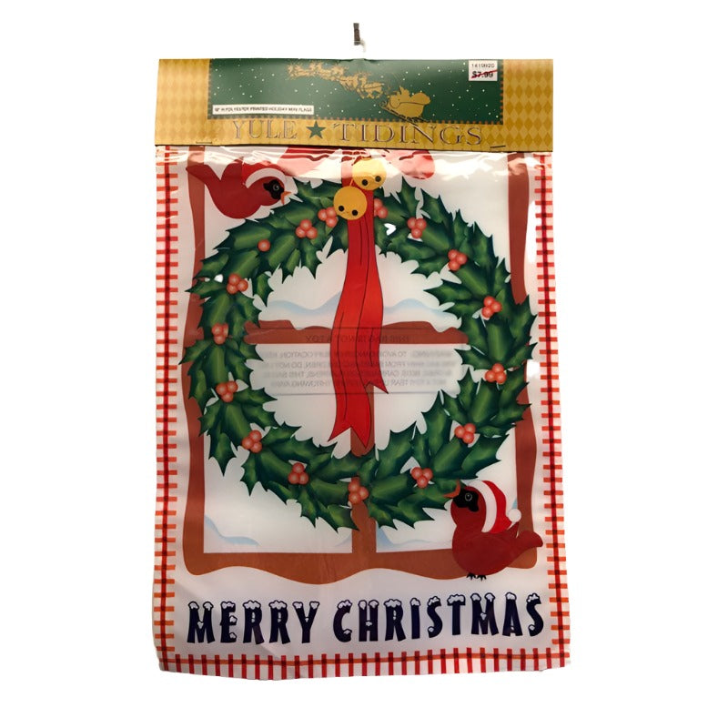 A framed windowpane holds a red and green leaf and berries decoration with golden bells and Santa hat clad birds. Brightly colored polyester with a wide rod pocket is perfect for decorating along your sidewalk or other outdoor area. Weatherproof and lightweight. Holder not included. Limited availability!