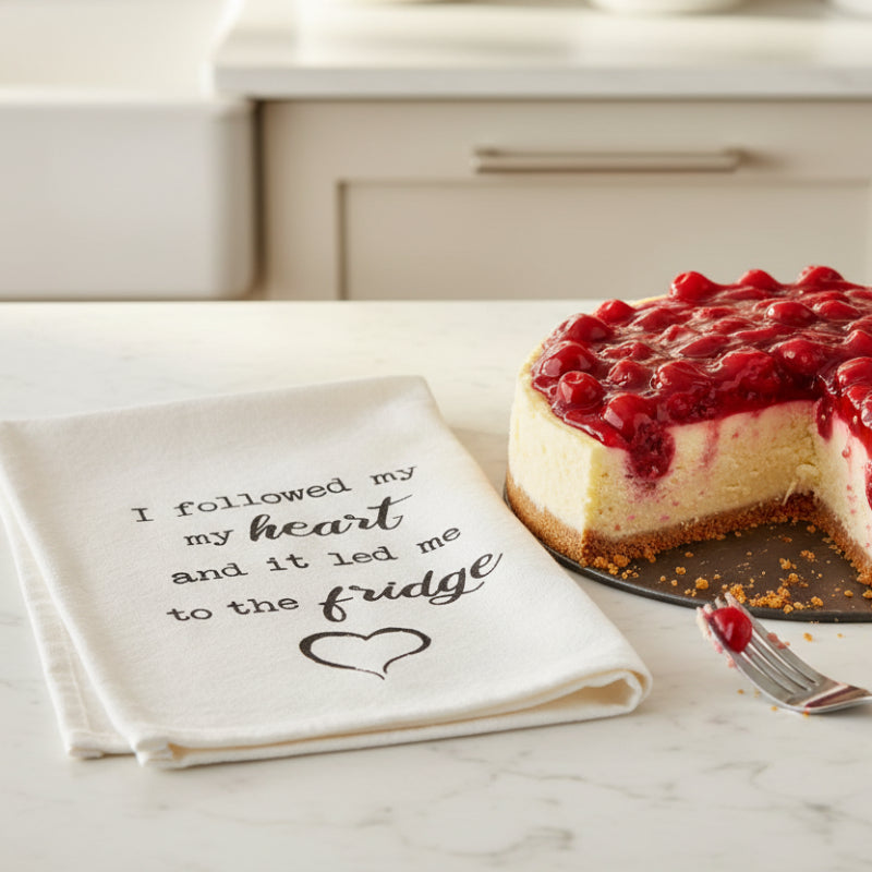 ".....and it led me to the fridge" is going to make friends and family snicker every time they see it. Got a midnight snacker? He or she will love the sentiment! White 100% washable, dryable cotton with a fabric look on the corner for hanging to dry. Over-sized for all your biggest kitchen messes and makes a great gag gift for the home cook, bachelor, or busy mother. Sold individually.