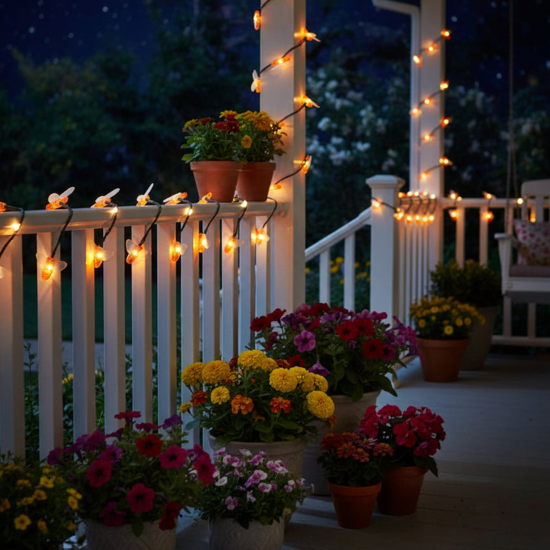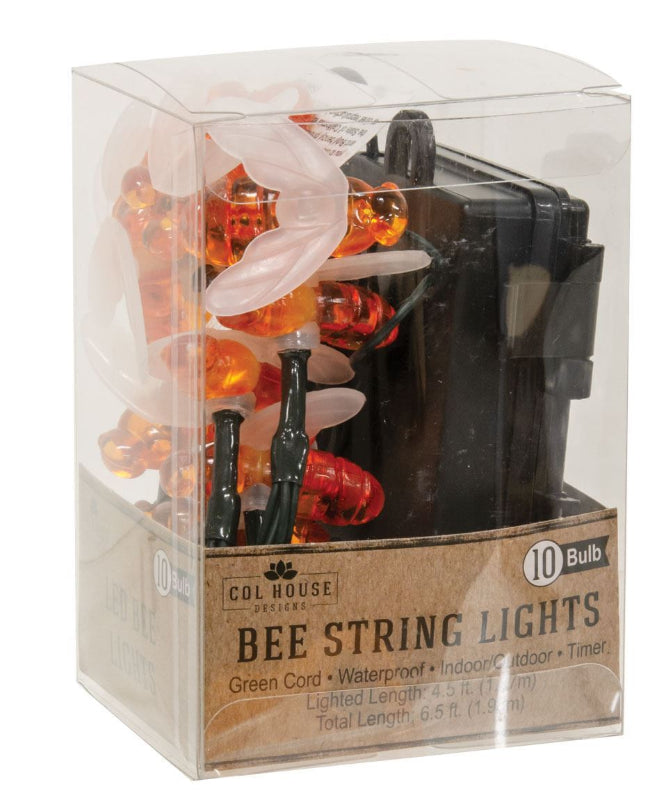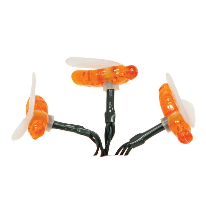 Strand of ten orange bumble bees with clear wings that feature an on/off and timer function that runs 8 hours on, 16 hours off so you don't have to remember to turn them off. Each is 6 inches apart and measure 1.5" H and 1.5" W. They are perfect for indoors or outdoors.