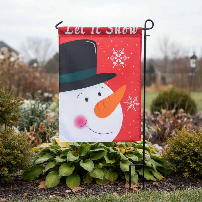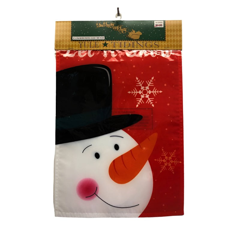 Depicts Frosty The Snowman against a red background of snowflakes. Brightly colored polyester with a wide rod pocket is perfect for decorating along your sidewalk or other outdoor area. Weatherproof and lightweight. Holder not included. Limited availability!
