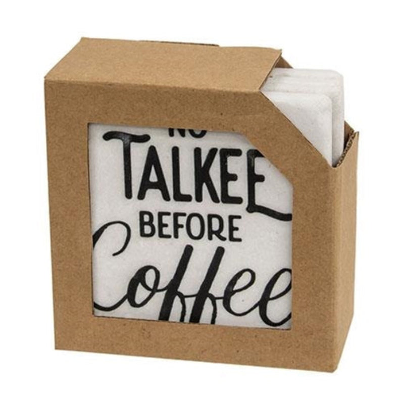 Pack of four squares with a white, crystal-like color and textured edges. These feature bold, black printed phrases; No Talkee Before Coffee, No Workee Before Coffee, Coffee until wine, and Coffee until cocktails. These are great for everyday use with any decor theme and can be used year-round to protect fine wood, glass, or other surfaces in the home or office. Bottoms are covered in cork to prevent scratches. Sold only as shown. Ships in a convenient box for gift-giving.