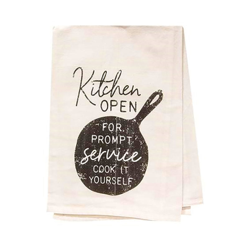 CLEARANCE - It's funny, it's practical, and it makes a statement in our do-it-yourself world. Made of thirsty 100% washable/dryable cotton linen printed with a printed distressed look frying pan and the words, "Kitchen Open...for prompt service cook it yourself." Over-sized for all your biggest kitchen messes and makes a great gag gift for the home cook, bachelor, or busy mother. Sold individually.