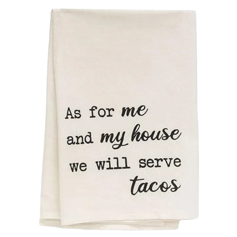 "As for me and my house............" great party hostess gift for Taco Tuesday! White 100% washable, dryable cotton with a fabric look on the corner for hanging to dry. Over-sized for all your biggest kitchen messes and makes a great gag gift for the home cook, bachelor, or busy mother. Sold individually.