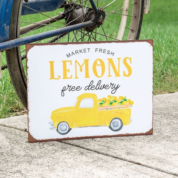 A bright, cheery way to add vibrant color and summertime charm to any indoor or outdoor kitchen decor! Distressed rusty edges with vintage inspired graphics against a worn, off-white background featuring an old yellow pickup truck loaded with citrus fruit........... "free delivery" stamped in black cursive text. Comes ready to hang by two sawtooth hangers on the back for easy installation to any flat, vertical surface.