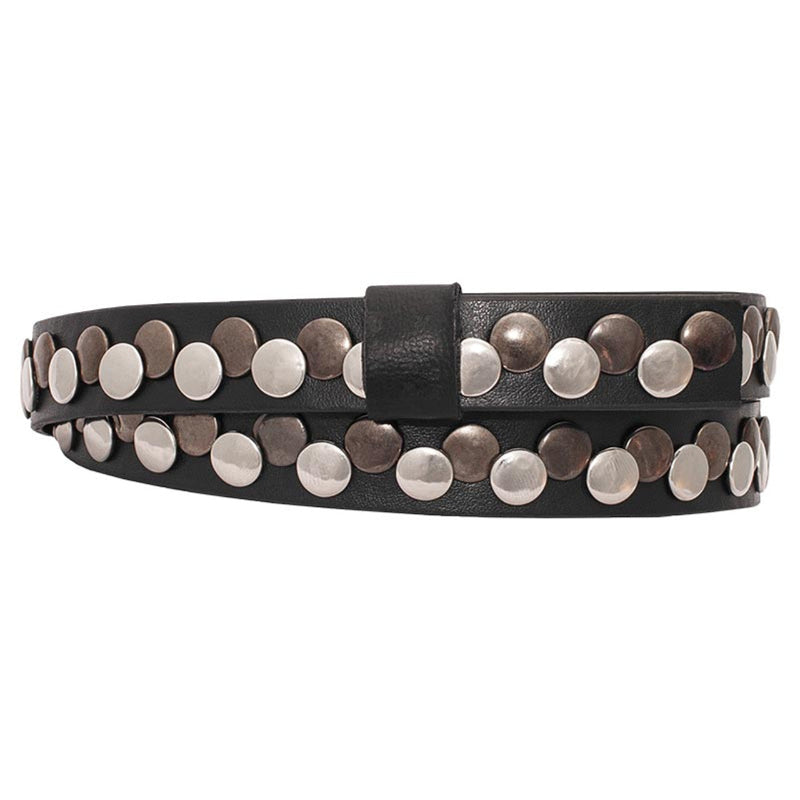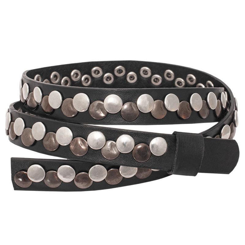 Both silver and bronze overlapping metal studs all the way around this beautiful hatband. It features a flat black leather band and ties where the ends join snugly together. Adjustable so you can change it out for different hats easily. Unisex for cowboys or cowgirls! Shown larger than actual size to show details.