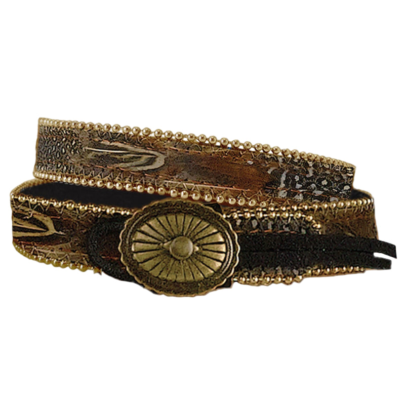 Made in the USA. Peacock like feathers decorate this beautiful hatband that is sure to dress up any hat, new or old. Features an oval shaped brass Concho with gold bead edged borders and black leatherette ties where the ends join snugly together. Adjustable so you can easily change it out for different hats. Unisex for cowboys or cowgirls! Shown larger than actual size to show details.