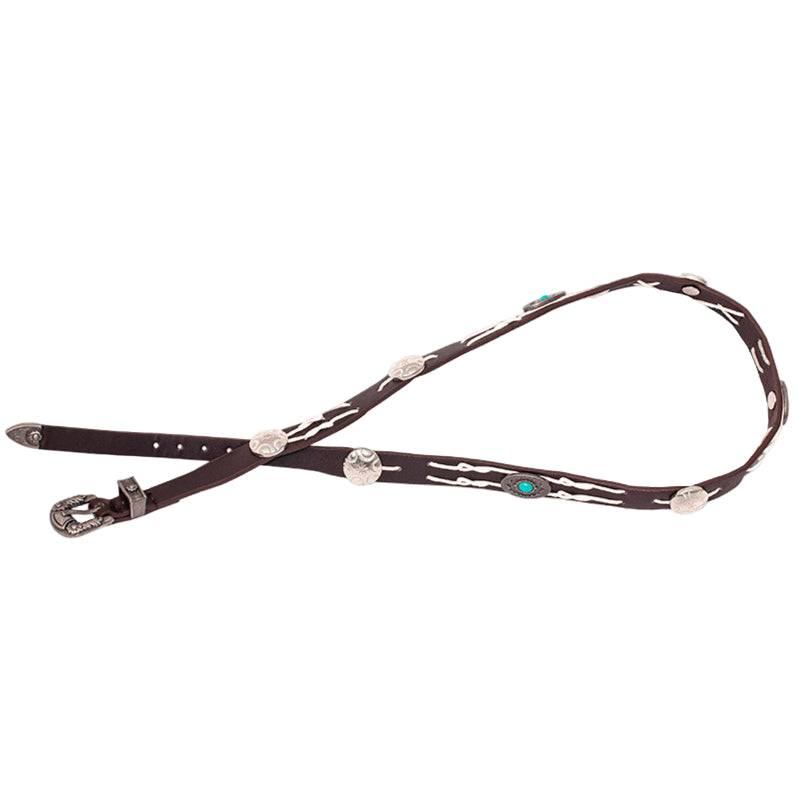 Made in the USA. Silver concho accents and simulated turquoise stones embellish this beautiful leather accessory. It also features belt buckle style closure with floral details on a flat band with ivory colored laces throughout. Adjustable so you can change it out for different hats easily. Unisex for cowboys or cowgirls! Shown larger than actual size to show details.