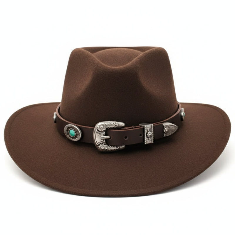 Made in the USA. Silver concho accents and simulated turquoise stones embellish this beautiful leather accessory. It also features belt buckle style closure with floral details on a flat band. Adjustable so you can easily change it out for different hats. Unisex for cowboys or cowgirls! Shown larger than actual size to show details.