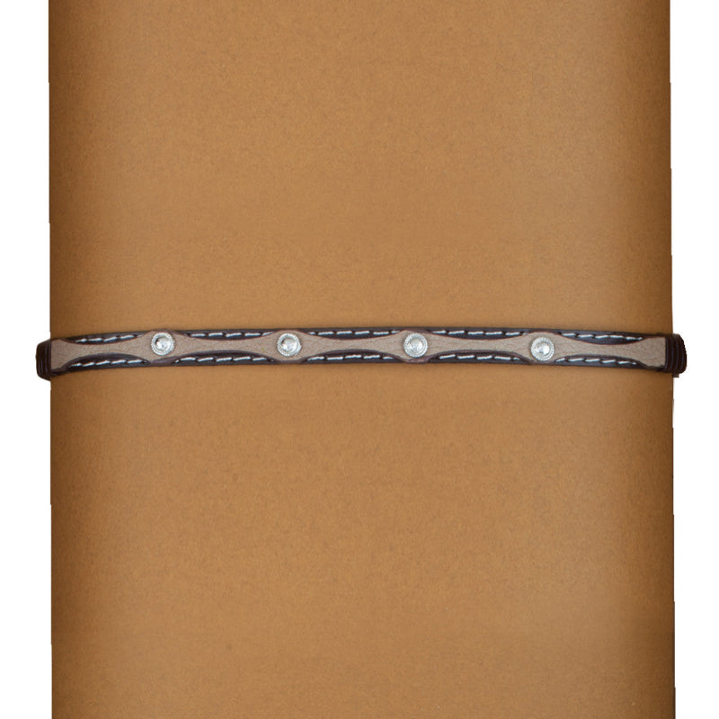 Made in the USA. Two tone both smooth and flat stitched belt is accented with four round, shiny .25" silver Conchos. This beautiful leather hatband is sure to dress up any hat, new or old, and will surely be a staple of your traditional western wardrobe. Adjustable so you can easily change it out for different hats. Unisex for cowboys or cowgirls! Shown larger than actual size.