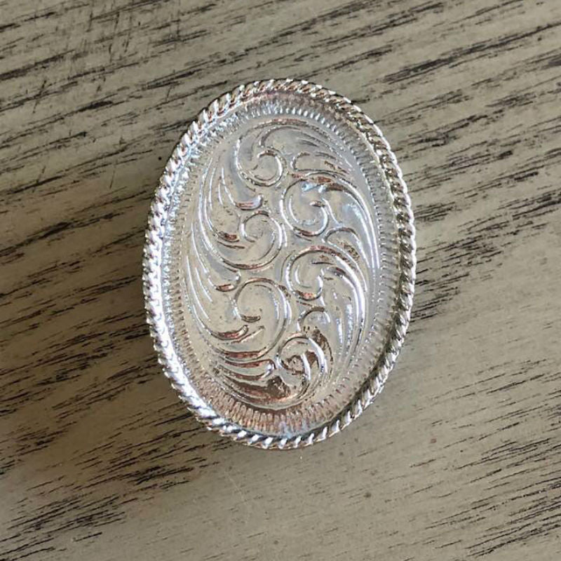 Made in the USA. Made in the USA. Mens or ladies brilliant, shiny with beaded rope details around the edge. Intricate swirling details are quite eye-catching. Tri-ring on back holds your handkerchief, bandanna, or favorite scarves securely without tying or pinning. Silver plated over metal alloy with cast back.