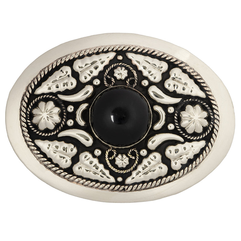 COMING SOON! Mens or ladies design with delicate floral finish accents and black background and features a round black stone in the middle. Pair it with one of our matching bolo ties and silver collar tips for an exquisite Southwestern look. The standard bale fits belts up to 2" wide. Gold plated over sterling silver. Also available in silver and turquoise, Item # FR-844.