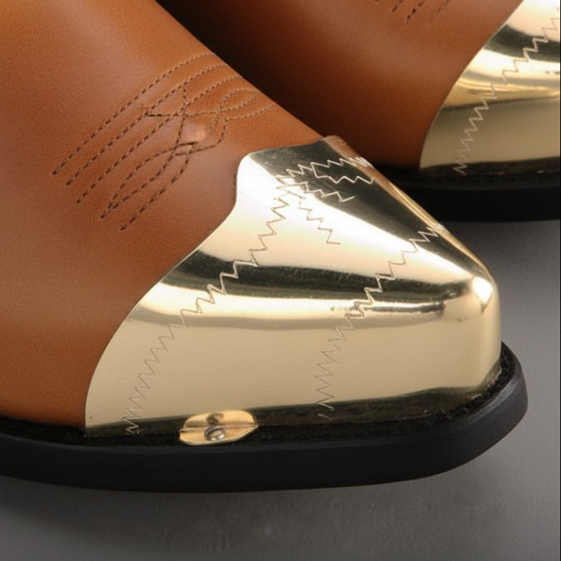 Gold plated, engraved zig-zag pattern. Protects your cowboy boot from scuffs, dirt, and damage. Form-fitting for most standard width Snip Toe styles but will also fit some narrower J Toe or J Snip Toe styles. Sold only as a set of two. See our engraved brass heel guards, Item WX-5.