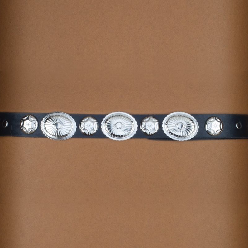 Made in the USA. Traditional silver oval Conchos with smaller round studded medallions and silver rivets are the focal points of this beautiful hatband. It features a flat black leather band and ties where the ends join snugly together. Adjustable so you can easily change it out for different hats. Unisex for cowboys or cowgirls! Shown larger than actual size to show details.
