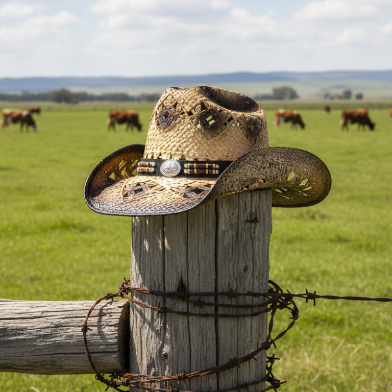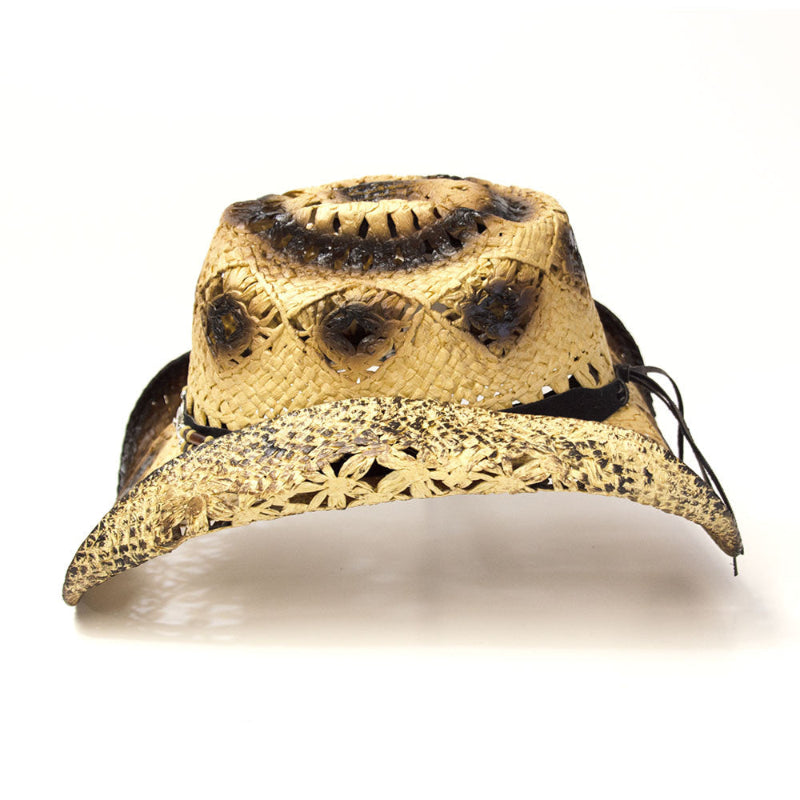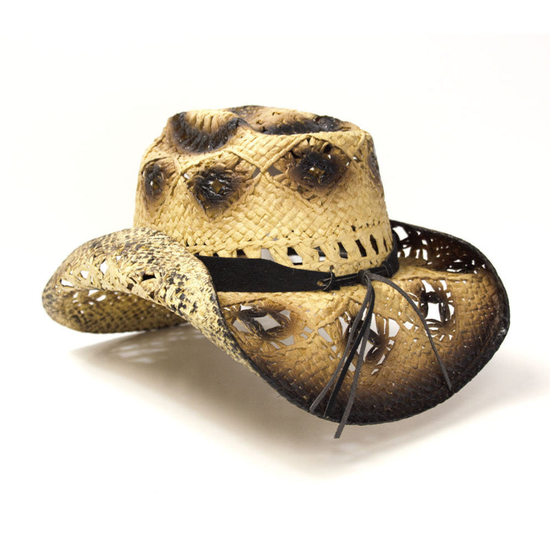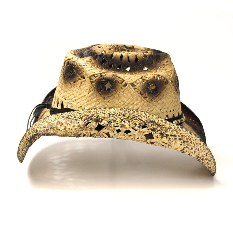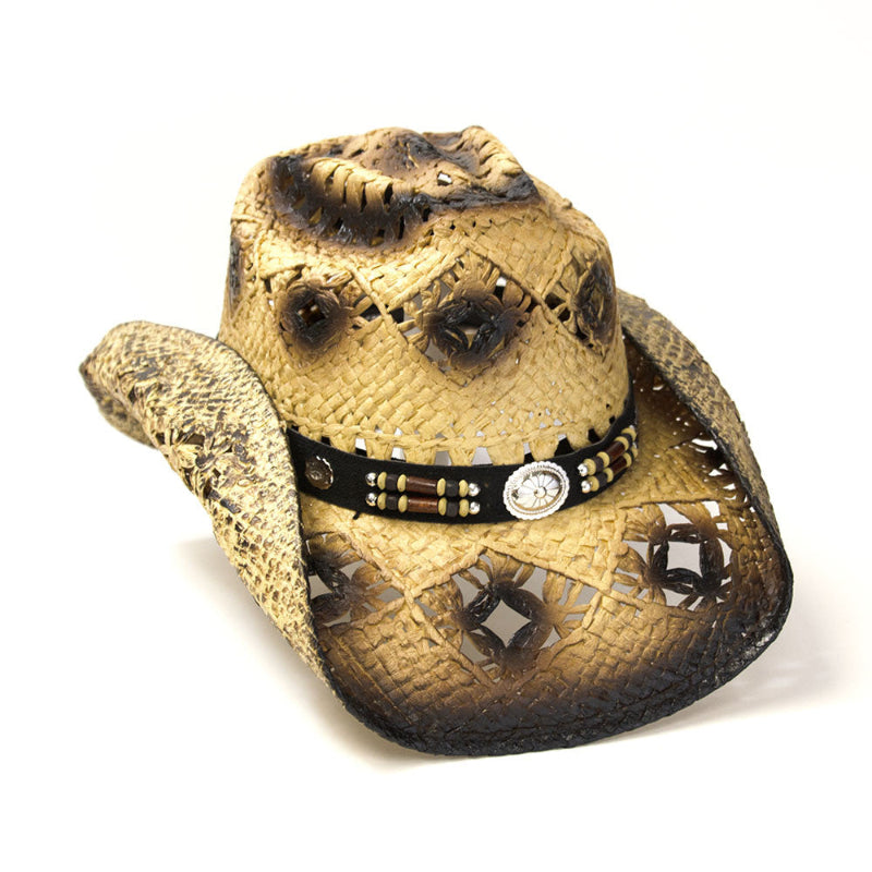 Classic rolled brim styling with a dual tone ombre brim with tightly woven coated mesh and an open weave vented crown for 4-season wear with diamond-shaped accents and a unique hatband in a tan, silver, and brown beads in complimentary colors with a silver medallion on the front. Colors and finishes may vary. Has an elastic fits-all band that comfortably stretches to fit a variety of adult sizes. Use our easy-to-use sizing chart for the perfect fit. Crown: 4.5" Bubble, Brim: 3.5" Rolled, Materials" Straw, leather, plastic, and metal. Make your size selection from the drop-down menu.