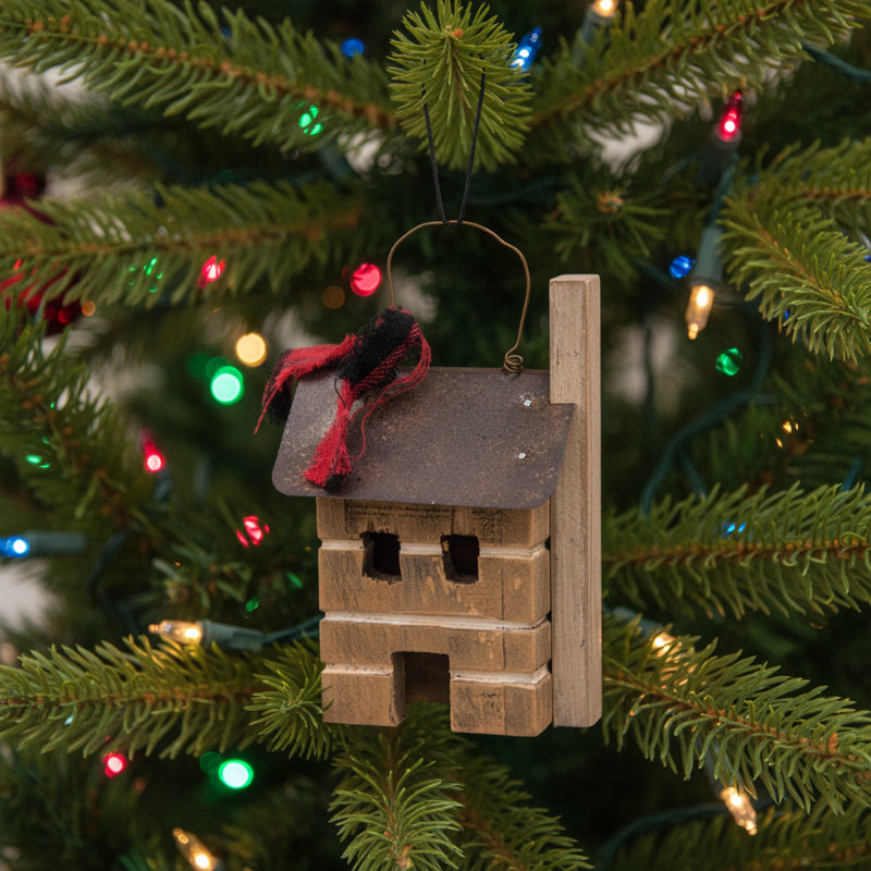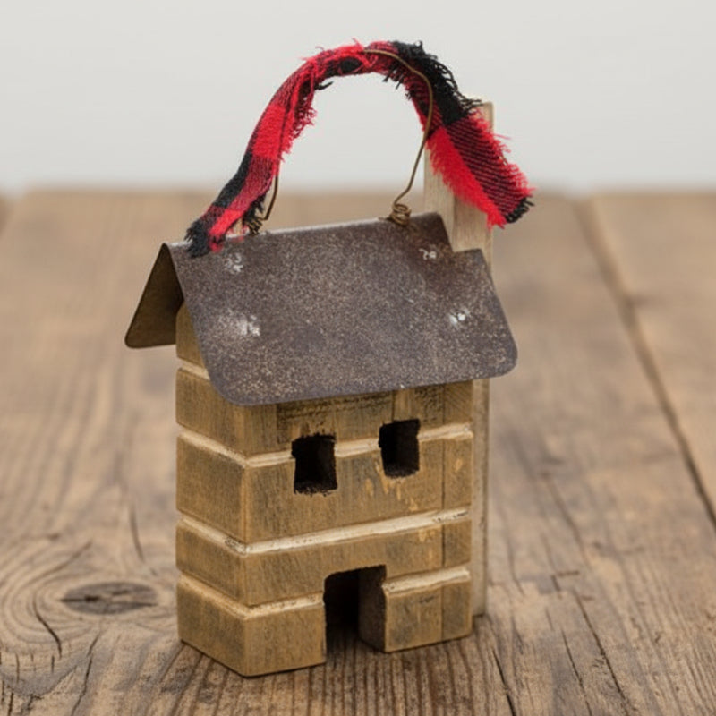Made of wood and finished to look like an old rustic log home with a metal roof, wooden chimney, and accented with a red and black buffalo checks bow on its wire hanger. Can be hung on your holiday tree or displayed free-standing. Sold individually.