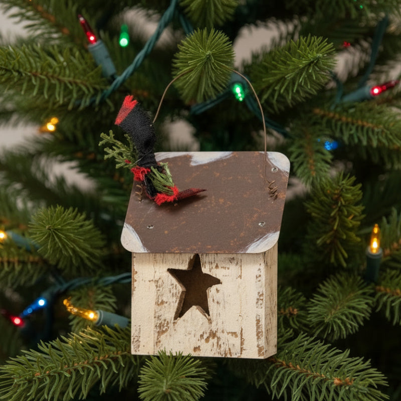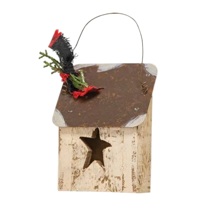 Made of wood with a painted, distressed finish to look like an old bird house with a rustic star cutout for the opening and a brown tin roof and an off-white exterior featuring faux greenery and a red and black buffalo check bow on the metal wire hanger. Sold individually.