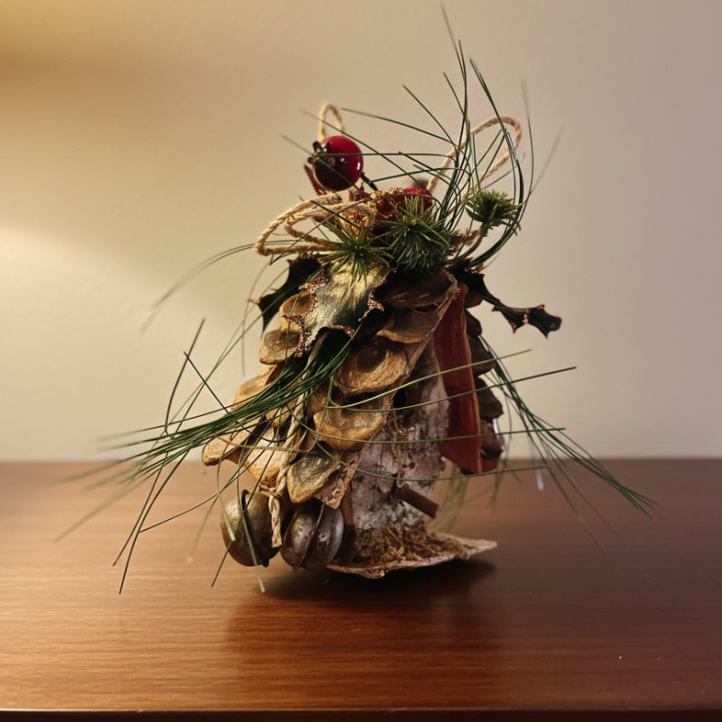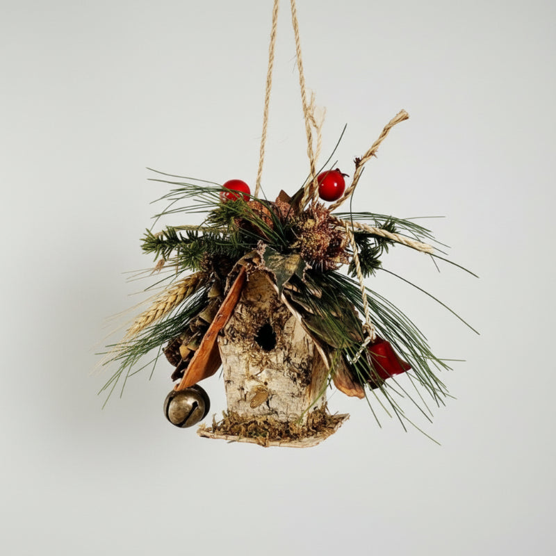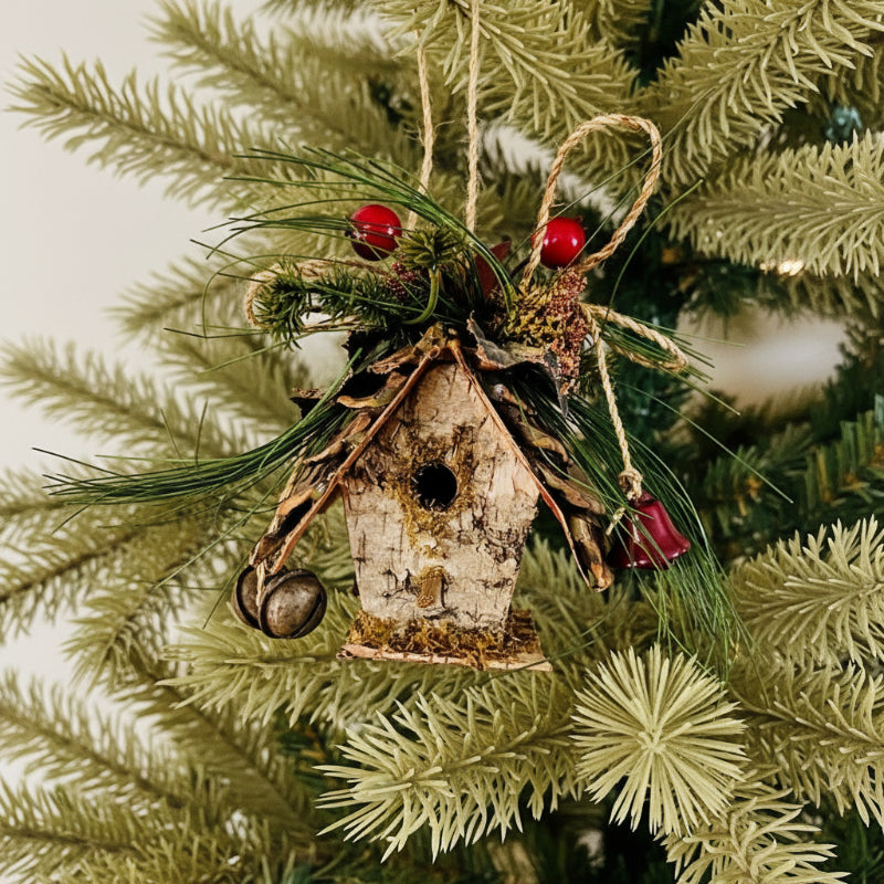 NEW FOR 2025! These will look absolutely beautiful on your nature themed holiday tree or included in a seasonal wreath. Made from thin sheets of actual bark with pinecone shingles and holly leaves, pinecones, and red rose hips on the roof with pine needle greenery, rustic metal bells hanging on ropes, and finished with a crimson 5-pointer, and a dusting of colorful glitter. Comes ready to hang on a braided jute hanger.