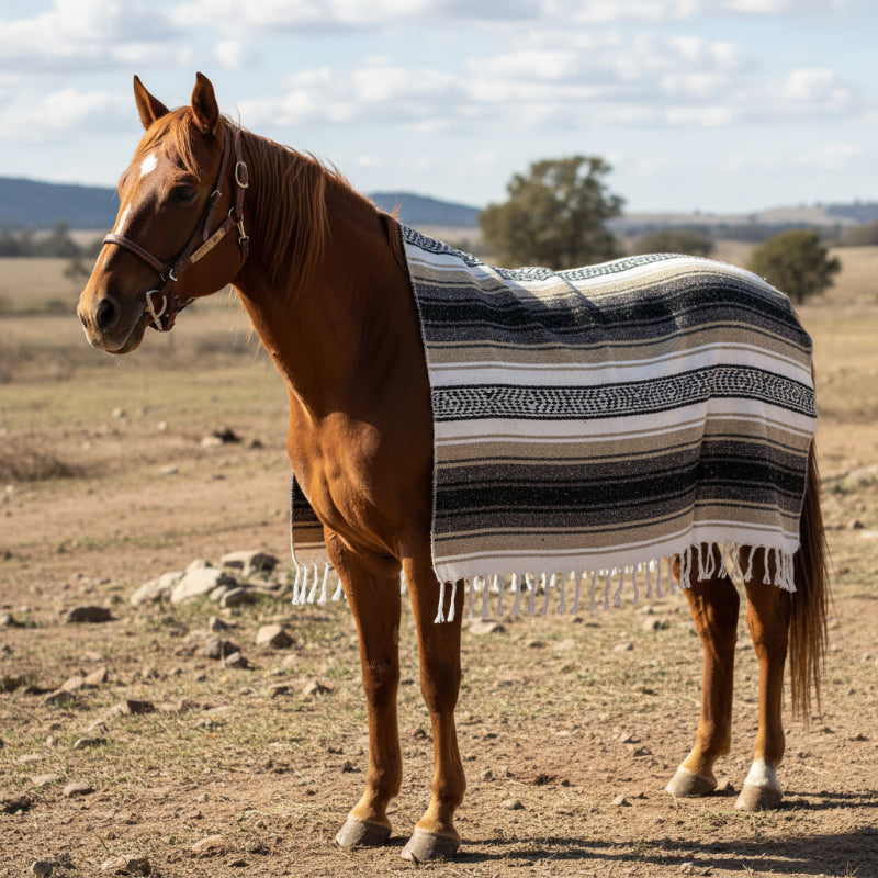 They're not just for horses you know? These thick and sturdy blankets are not only warm, they are also great as a colorful accent piece, tabletop use, as a picnic blanket, to sit on in car, great for padding outdoor folding chairs, sporting events, use as a yoga mat, camping, and more. Knotted fringes on both ends with finished side edges. Woven of 50% acrylic and 50% polyester. Washable and dryable. Six colors to choose from. Make your selection from the drop-down menu.