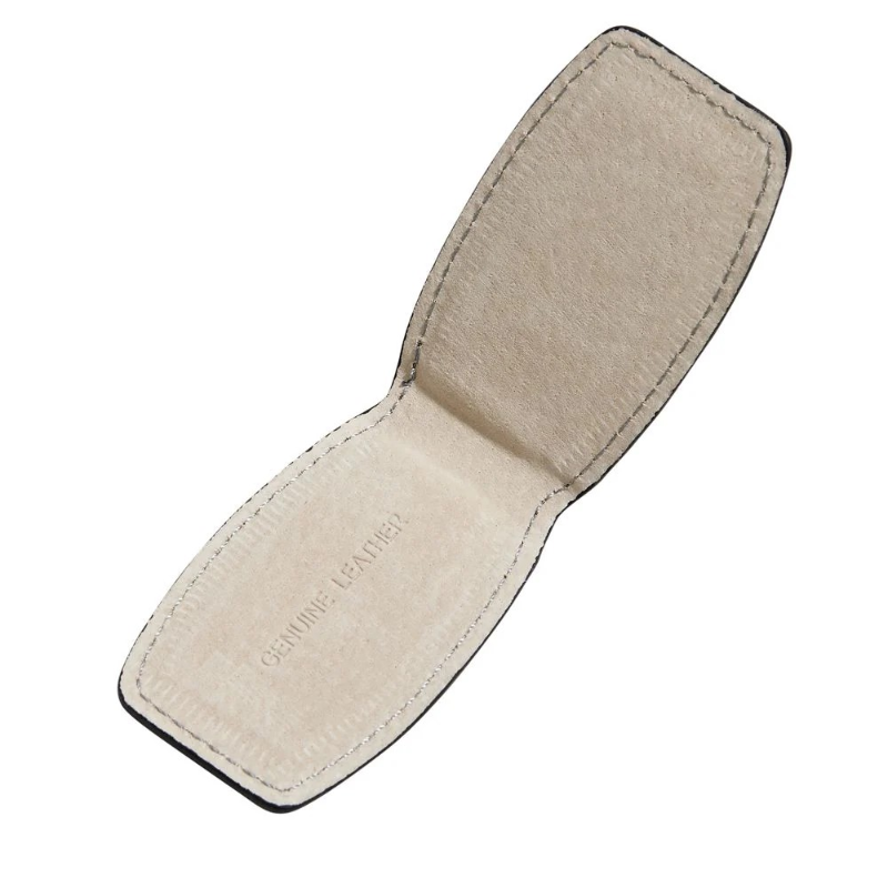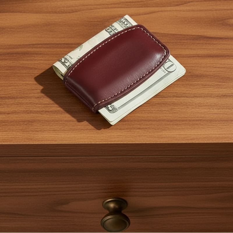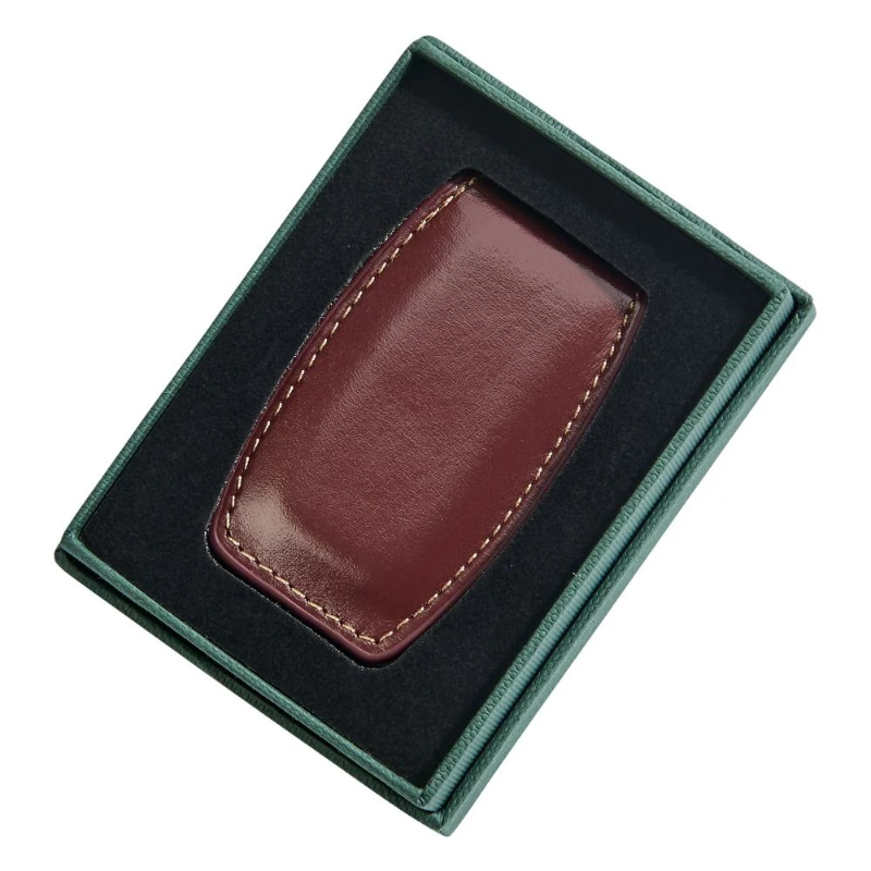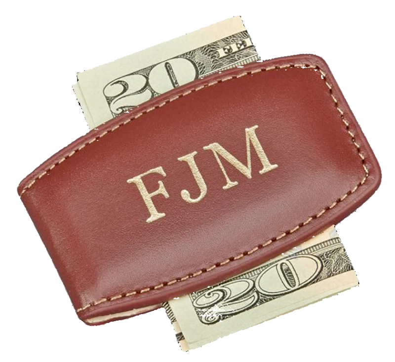 Has magnets embedded beneath genuine, premium grain hide that allows secure holding of your paper currency with detailed stitching that runs all around the edges on both sides. Can be easily personalized or monogramed for gift-giving by request for an additional fee. Also available in black, Item #056501. Ships gift boxed as shown.