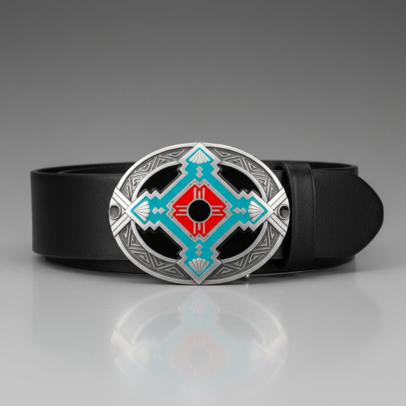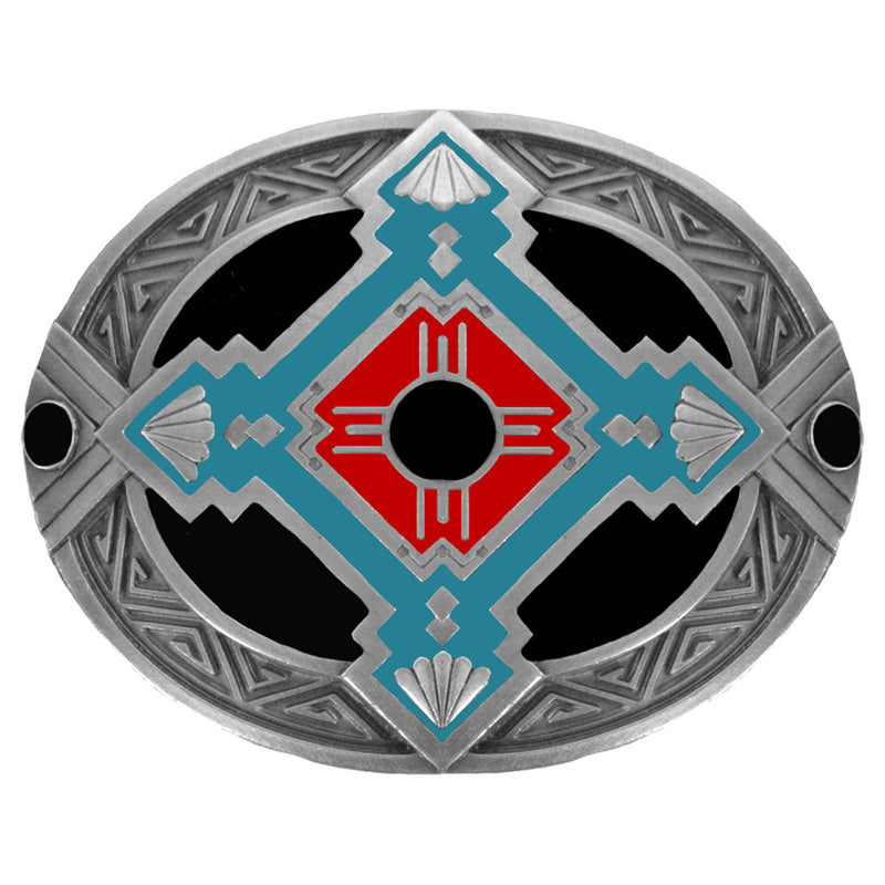 Made in the USA. Features a deeply detailed array of diamond shapes, chevrons, arrows, and Aztec style channels set in an oval frame with red, black and turquoise enamel inlays throughout. Fits belts up to 2" wide with a standard bale on the back. Solid metal cast, lead-free zinc aluminum, and non-toxic epoxy.