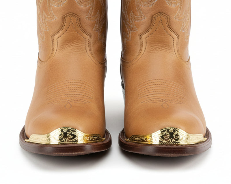 Gold plated, embossed vine and zig-zag pattern. Protects your cowboy boot from scuffs, dirt, and damage. Somewhat flexible for a custom fit for most standard width J Toe and J Snip Toe styles. Sold only as a set of two. See our matching engraved brass heel guards, Item WX-5.