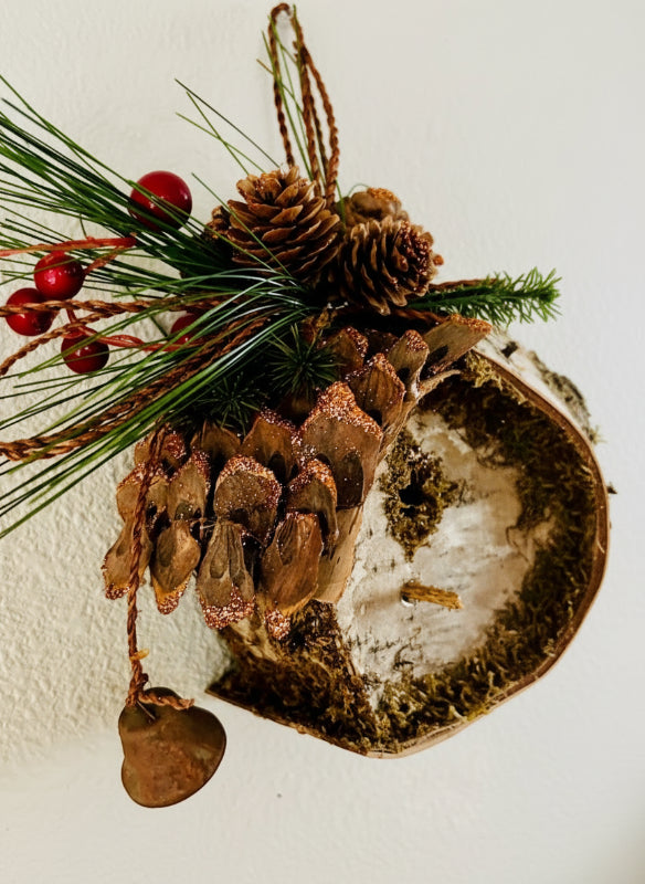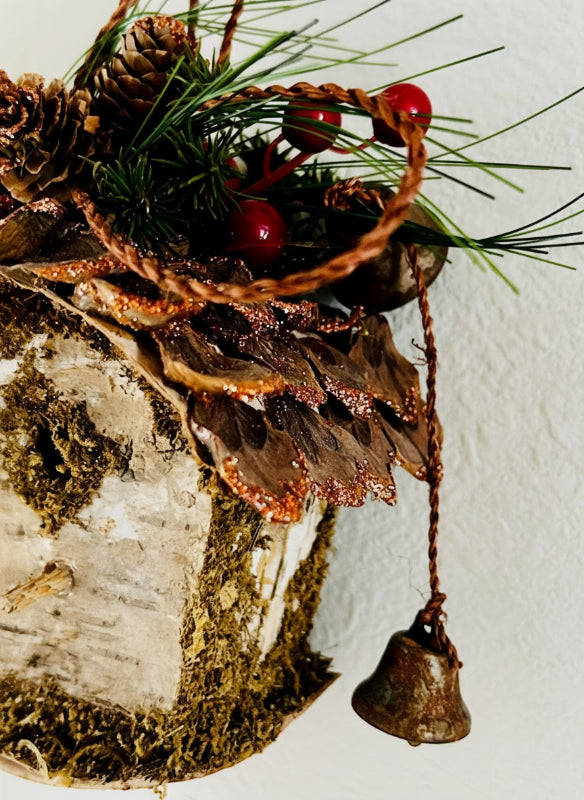 NEW FOR 2025! These will be beautiful on your nature or bird themed holiday tree or included in a seasonal wreath. Made from thin sheets of actual bark with pinecone shingles, real mini pine cones, and red rose hips on the roof with pine needle greenery, rustic metal bells hanging on ropes and a dusting of colorful glitter throughout. Comes ready to hang on a braided jute hanger.