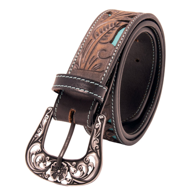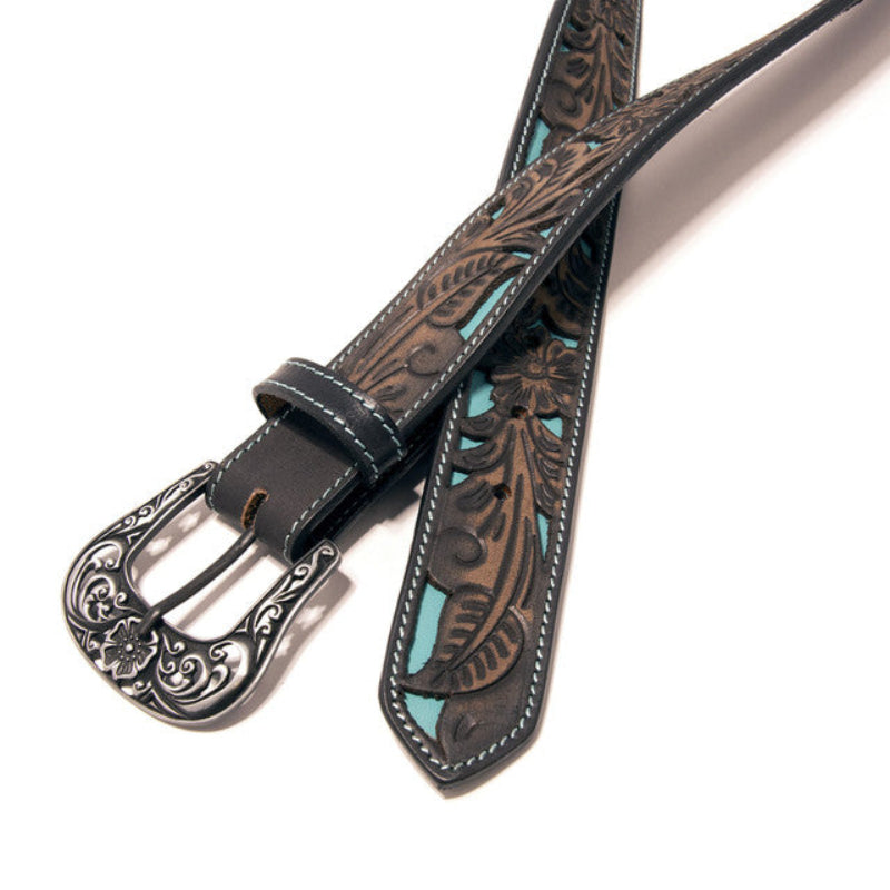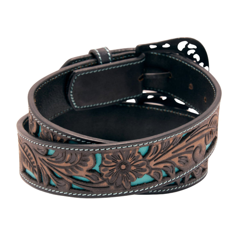 Features intricate tooling with stylish black/brown cutout accents across the entire length that adds extra depth and elegance to classic cowboy or cowgirl styling as well as single contrasting stitching along the edges that adds strength and durability to the life of the item itself. Crafted from durable, high quality materials offering a sleek ebony finish with an eye-catching turquoise background that's perfect for everyday jeans or for a dressy night on the town. This one has unique, timeless styling and character with a flower design removable highly polished silvertone buckle with swirls and serif designs. Finishes include: 1-1/2 inches wide and 1" between holes. Choose your size from the drop-down menu.