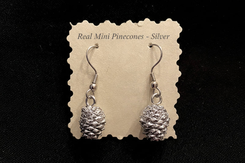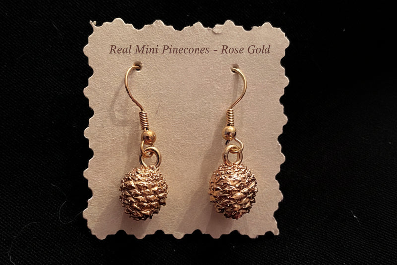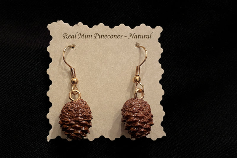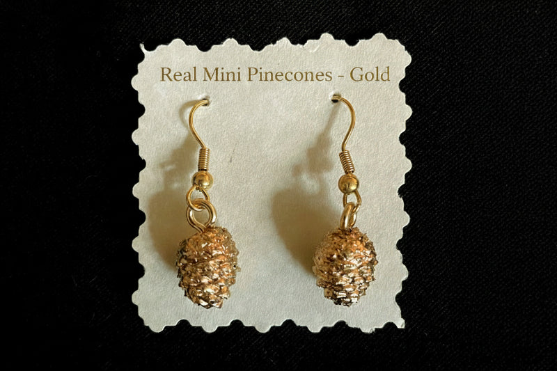 Made from authentic tiny wooden pinecones hand-selected from Mother Nature for size and shape, collected in Wyoming. These are dried slowly, sanitized, matched into pairs by size and shape, and hand-constructed so no two pair are identical. A symbol of optimism and positive outlook, worn for support and new adventures, each cone is hand-sealed in acrylic and then hand-dipped in brilliant gold leaf, silver leaf, or rose gold leaf. Naturals are sealed in high gloss acrylic to preserve color with goldtone backs and findings. Goldtone, silvertone hypo-allergenic French wire backs with large bales for maximum movement to catch the light. See also our necklace pendants, sold separately. Make your finish selection from the drop-down menu.