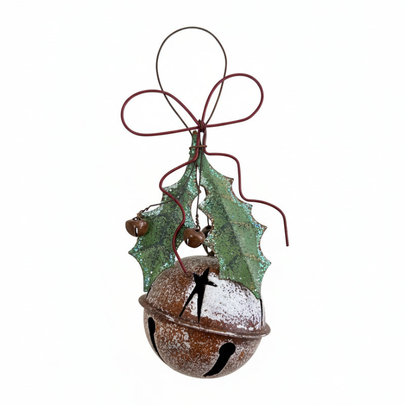 Constructed entirely of metal and wire. Two holly leaves are attached to a free-form wire hanger, embellished with two rusty bells and a clear Lucite bead make the perfect hanger for the 2.25" diameter keyhole and stars sphere with a small ceramic bead inside to make a joyful noise when rattled. Finished with a dusting of sparkling glitter. Sold individually. Made by Sunset Vista Designs.