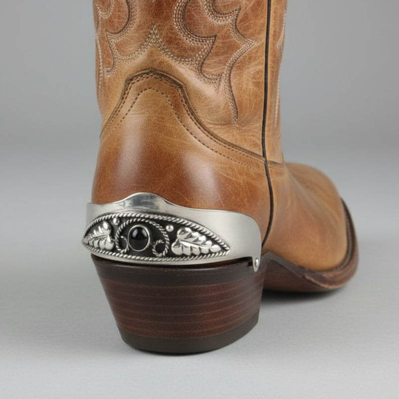 Silver plated rope pattern with leaves, swirls and studs framing a shiny black Cabochan in a flat bezel setting. Hand made and hand engraved details. Protects your cowboy boots from scuffs, dirt, and damage and adds a stylish western flair to any attire. These are form-fitting to most standard width boots. Sold only as a set of two. See our matching toe tips, Item #WX-23.