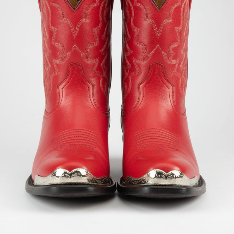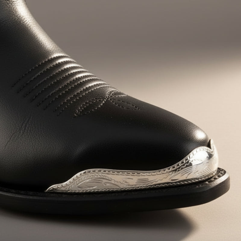 Silver plated with a floral and zig zag pattern on the lower portion and a shiny braided rope pattern bordering the top portion. Plated over brass. Protects your cowboy boots from scuffs, dirt, and damage. Somewhat flexible for a custom fit for most standard width J Toe, J Snip Toe and some R Toe styles. Sold only as a set of two. See our matching engraved heel guards, Item WX-36.
